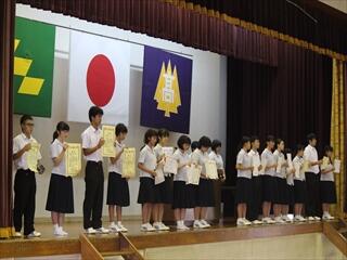 駅伝部、男女バスケットボール部の全国大会予選優勝の表彰式が行われました。