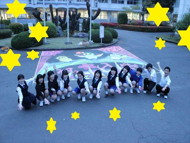 夕方5時から7時までかけて描きました。翌日、朝から雨が降り、少し流れてしまい残念でしたが、みんなで協力して描いたこと自体が、楽しい部活の思い出となりました。