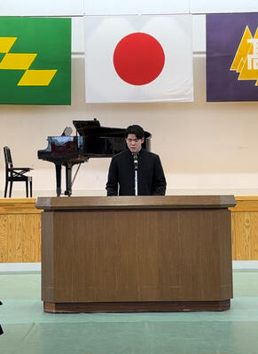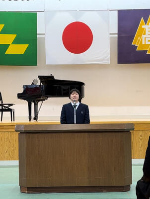落合 晃雅さんが、コロナ禍での寮生活を振り返り、仲間や後輩、体育科職員や生徒寮職員などそれぞれに感謝の言葉をおくりました。そのうえで、小林高校生徒寮だから学べたことをこれからの人生でいかしていきます、と決意を述べました。