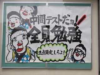「8時だよ!全員集合!」を模倣してみたのですがどれだけの生徒が昭和の娯楽番組を知っているのか不安な中、描いてみました。掲示する前に、書道部の生徒の反応を確かめると「知ってます!」と笑ってくれました。