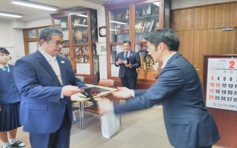 昼休みの時間、ボランティア委員が交代で1・2年全クラスをまわり、生徒のみなさんに募金を呼びかけました。集まった皆さんからの大切な募金を、先日、2年の豊原さん、立山さんが代表して、小林市社会福祉協議会の方にお渡ししました。豊原さんは「想像していたより沢山の募金が集まり、地域のためのよい活動になりました」と感想を述べました。