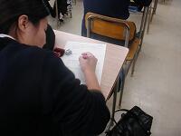 3年生の商業科専門の科目に『総合実践』があります。『総合実践』は、商業の各分野で学んでいる基礎的・基本的な知識を実践的・体験的な学習を通して総合的に習得することを目的に行われています。本日の32HRの授業は3回目の授業になり、挨拶練習(姿勢、発声、お辞儀)を行い、ビジネスマナーについて考えました。後半では、封筒宛名書きを勉強しました。なれない作業に苦戦しながらも、なんとか完成させていきました。