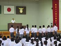 生徒会任命式では、先日行われた生徒会選挙で選ばれた10名の係紹介や、新旧生徒会長のあいさつがありました。