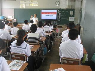 本日午後から新富町内にある中学校2校の高校説明会へ行きました。富田中学校は3年生と保護者、上新田中学校は全校生徒と保護者の方々に本校の説明を聞いてもらいました。どちらの中学校も、本校の案内パンフレットを見ながら、熱心に話を聞いてくれました。ただ、案内パンフレットが昨年のもので申し訳なかったのですが、次回からは最新のものを持参して説明する予定です。