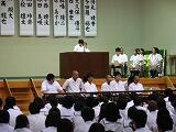 7月12日(木)の5・6時間目に4名の卒業生を迎えて、「卒業生からのメッセージ」を実施しました。会場だった体育館は、非常に暑く熱中症を心配するような状態でした。しかし、卒業生が一生懸命に話をしていただき、在校生は真剣に聞いてくれました。とても参考になるアドバイスばかりで有意義な時間でした。
