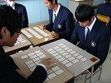クラス内で班を作りお互いに札を取り合っています。上の句で反応する生徒もいて、句が読まれるたびに歓声が上がっていました。