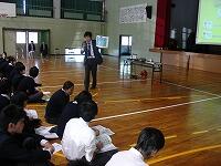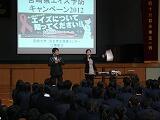 エイズに関する正しい知識や感染予防の知識を知って、自分を守ること・相手を思いやる心得を養い、不幸な事態を招かないための一助とすることを目的として、宮崎大学 安全衛生保健センター 江藤敏治氏と、JOYFMパーソナリティ 山本円さんを招いて特別講演性教育講話を行いました。世界を取り巻くエイズの状況と日本の状況を比較しながら話が進むなかで、生徒一人一人がエイズについて真剣に考える機会を作って頂き、大変貴重な講演会となりました。