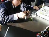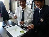 「ほうれん草の葉緑素を取り出す」実験でほうれん草の葉とシリカゲルをすりつぶし粉末を試験管に入れ、ジエチエーテルを教科担任に入れてもらい試験管に液体とろ紙を入れ色素の分離を観察しました。緑色だった液体が青、黄、橙色へと変化していくのを確認することができました。生徒一人ひとり自分のろ紙を作成しお互いに見比べて変化を確認し真剣に取り組むことができました。