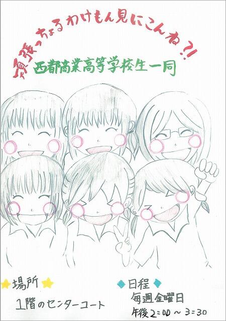 毎週金曜日に西都市内のショッピングセンターPAOにて、販売実習を行っている三年生が先週受けたPOP広告講座の知識を活かし広告作成を行いました。前回作成したものは、店舗広告で高校生による販売を行っていることを中心に作成したので、今回は商品PRを中心に作成しました。なじみやすい絵・キャラクターの利用、色使いを意識して作成しました。次回の営業は、9月28日(金)になっています。是非ご利用ください。