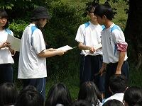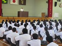 生徒会任命式では、先日行われた生徒会選挙で選ばれた10名の係紹介や、新旧生徒会長のあいさつがありました。