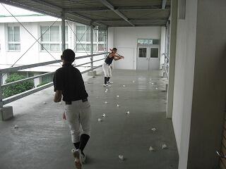 昨日から1学期末考査が始まりました。通常なら放課後の部活動は原則として出来ないことになっていますが、来週末から第95回全国高校野球選手権宮崎大会(夏の甲子園大会県予選)が開催されることから、野球部が短時間の練習をしています。生憎の雨でグランドが使用できないこともあり、校内の渡り廊下でシャトルの羽根を使い柔軟に変化球に対して対応できるようバッティング練習をしているところです。