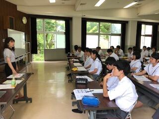 自衛隊宮崎地方協力本部 新田原分駐所 広報員 の方々がお見えになりました。国家公務員である自衛隊について、現職の広報員から説明および今年度の状況等を指導していただきました。現職の自衛隊の方と接する機会がないので、最初は緊張気味の生徒でしたが、進路について真剣に考えているので一言一句逃さず、全ての説明を理解しようと必死に傾聴していました。”愛”国精神を持って現職におつきになっている自衛隊の姿に圧倒したと同時に、尊敬心が芽生えたようです。