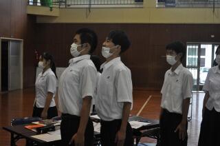 3密を避けるため、生徒どうしの間隔をあけて始業式・新任式をしました。