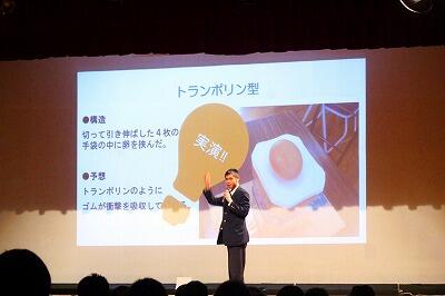 体育館では、校外の防災訓練講座に参加した職員が講座の内容を振り返りながら話をしました。