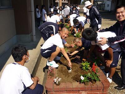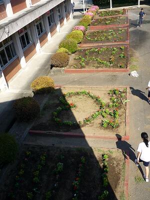 各クラス、思い思いのデザインで花を植えていきます。