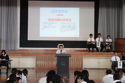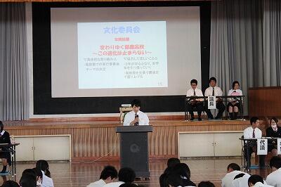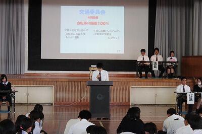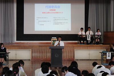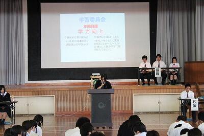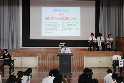 まずは、生徒会が提案した今年度のスローガンが採択されました。