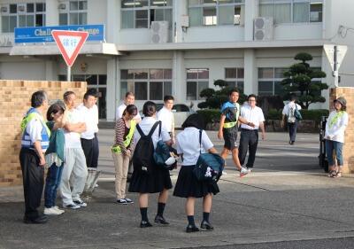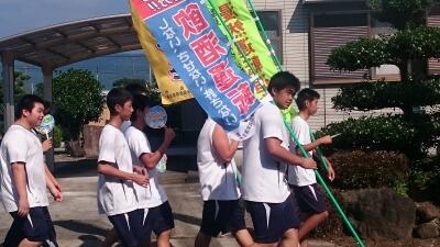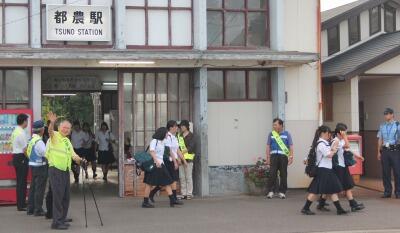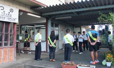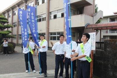 交通安全ののぼりを掲げて、スタンバイする都農高生。