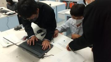 12月8日(水)の放課後に、2年生希望者4名が大分県立大分舞鶴高校SSH重点枠事業「スペースサイエンスカフェ」に参加しました。同校のALTが英語でプログラミングについて説明し、生徒は実際にコードを作成し、液晶画面や超音波で距離を測定する装置を制御しました。
