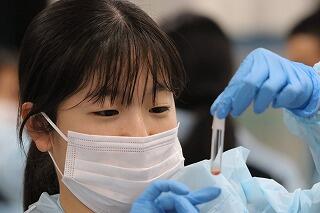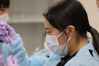 生命医学部 臨床検査技師コース 梅木 一美 教授、三苫 純也 教授による実習 「臨床検査技師の仕事の体験~血液型を検査する~」