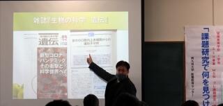 1月17日(月)の1年生プレ課題研究では、南九州大学の秋山 繁治教授をお招きし、「課題研究で何を見つけるのか」について講演していただきました。秋山先生は、2006年から10年間、岡山県のノートルダム清心女子高校でSSH事業の企画・運営に取り組み、文部科学省のSSH事業の中間ヒアリングでも1期,2期ともに最高位の評価を受けていらっしゃいます。先生から指導を受けた生徒は、国際学会で賞を受賞するなどその手腕は高い評価を受けています。