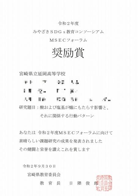 8月にオンライン上で開催された「みやざきSDGs教育コンソーシアムフォーラム」の表彰状が届きました。3年生は、努力の成果が認められ達成感を持って大学受験に向かいます。