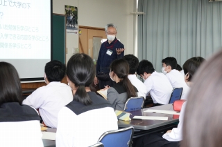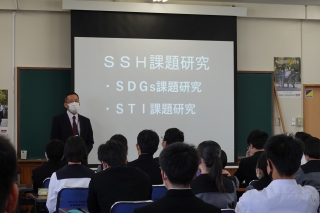 九州保健福祉大学から本校SSH運営指導委員の竹澤教授をお招きし、課題研究の進め方について、説明していただきました。昨年度2年生の課題研究で得られた課題を元に、今年度は課題研究に取り組む前に、具体的な方法論を指導する試み取り入れました。