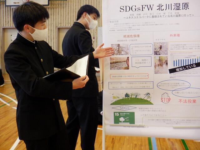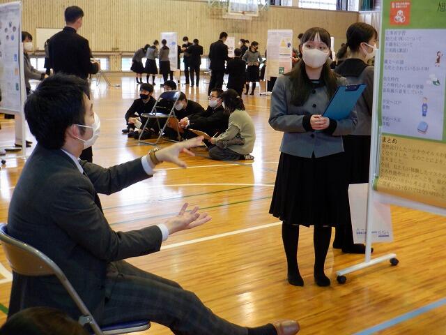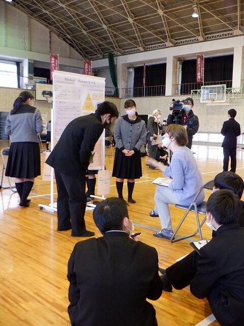 1年SDGsフィールドワーク発表会 投稿日時 : 2021/02/05 学校管理者 2月5日(金)の午後、1年生SDGsフィールドワークの発表会を行いました。新型コロナ感染防止対策として、会場を体育館、武道場、Zoomの三会場に分け、換気を徹底した上で、全員マスクを着用して発表に臨みました。 延岡高校では1年次から発表を経験させることによって、表現力を育成しています。Zoom会場では、地域の中学校の先生方に対して、プレゼンテーションを行いました。校長も質問しています。企業メンターの方もお招きしました。ALTも参加しています。SSH運営指導委員もお招きし、専門的な見地から質問していただきました。SSH事業は、科学技術振興機構(JST)からの支援を受けて実施しています。 Tweet