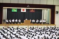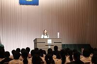 生徒会任命式では、3-4 今城さちさんが生徒会長の任期を終え、全校生徒に挨拶をしました。