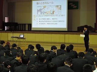 部屋の鍵を一旦預けて出発します。 情報技術科の生徒達