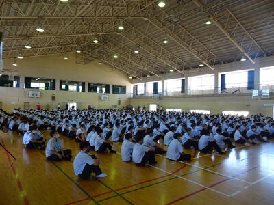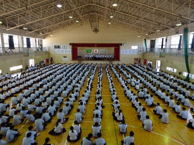 暑さと感染対策のため、大型扇風機を10台以上配置し、全学年生徒を体育館に集めての実施です。