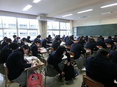 本日から2月26日(金)までの4日間、学年末考査が始まりました。本年度最後の定期テストです。1年生は10科目、2年生は12科目のテストがあります。生徒の皆さん、精一杯頑張って、平成27年度の『有終の美』を飾ってください。
