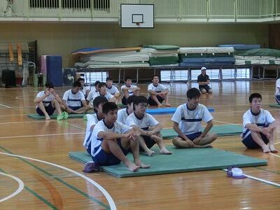 女子は徳永先生のユーモア溢れる中にも、生徒の元気を引き出す指導のもと、大きな声を出しながら頑張っていました。男子は、宮本先生、圖師先生という体操専門の先生コンビが手取り足取りの丁寧な指導のもと、『帆掛け船』の練習に励んでいました。
