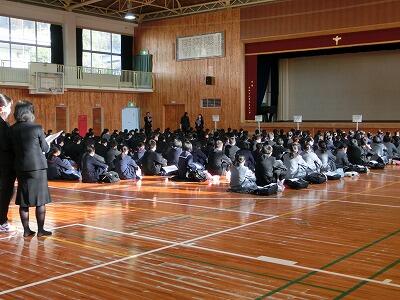 2月26日(金)、学年末考査終了後、1.2年生の学年集会が開かれました。1学年集会では、14HR担任の宮本先生が『小さな努力を積み重ねる大切さ』について話されたあと、柳田先生が進路について話されました。2学年では、岩崎先生が顧問をしているハンドボール部の九州大会出場を経験して『自覚することの大切さ』について話されたあと、学年主任の平先生から『当たり前にできることを増やしていこう』という話がありました。