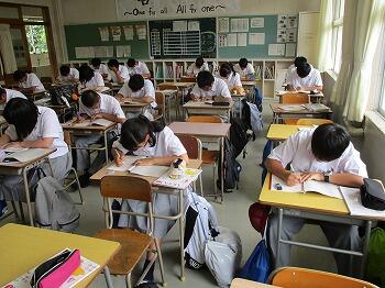 その後、1年生の授業を見に行くと、11HRが「音楽」の自習をしていました。誰一人しゃべらず、黙々と真面目に自習課題に取り組んでいました。「自習のときは、いつもこんなに静かなの?」と聞いてみると、「はい」と答えてくれました。素晴らしいことです。