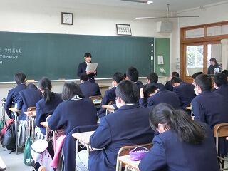 3年生の代表が1.2年生の各クラスに分かれて、自らの進路決定までの体験を話してくれました。就職から大学進学まで3年生の様々な進路体験を、1.2年生はメモを取りながら、真剣に聴いていました。