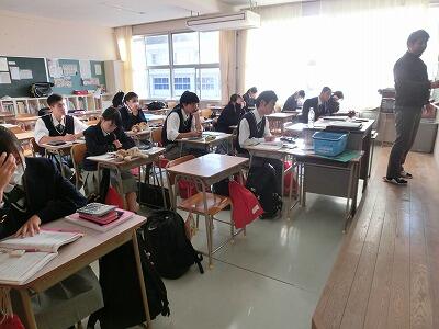 ホームページをアップするために学校へ行くと、教室から生徒たちの声が聞こえました。声をたどって3階へ上がってみると、空手道部とソフトボール部の部員たちが勉強会をしていました。勉強会の後、おそらく練習をするのでしょう。勉強と部活動の両立は立派です。