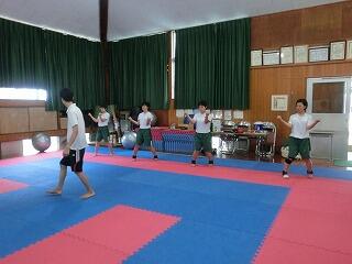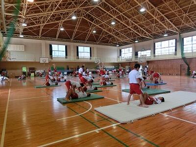女子は徳永先生のユーモア溢れる中にも、生徒の元気を引き出す指導のもと、大きな声を出しながら頑張っていました。男子は、宮本先生、圖師先生という体操専門の先生コンビが手取り足取りの丁寧な指導のもと、『帆掛け船』の練習に励んでいました。