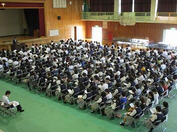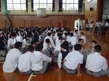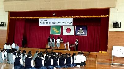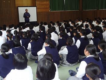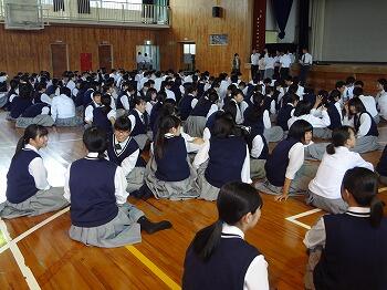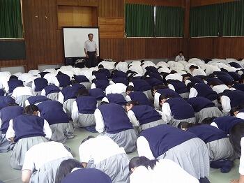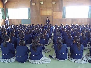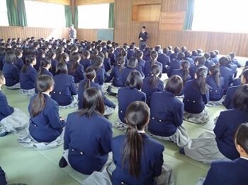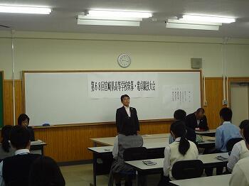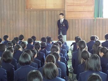 新役員挨拶、旧役員挨拶、無言集合の呼びかけ、中須先生の話、校歌斉唱の流れでした。
