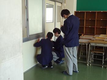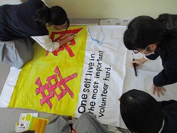 玄関では、前田先生と木下先生が二人の生徒と一緒にメインの看板づくりを行っていました。立派な看板ができそうです。