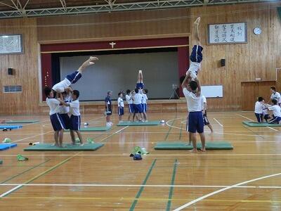 ☆宮本先生から『3点倒立成功の秘訣』の説明を聞いています。