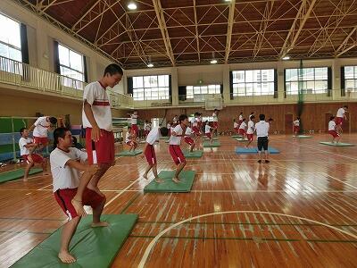 女子は徳永先生のユーモア溢れる中にも、生徒の元気を引き出す指導のもと、大きな声を出しながら頑張っていました。男子は、宮本先生、圖師先生という体操専門の先生コンビが手取り足取りの丁寧な指導のもと、『帆掛け船』の練習に励んでいました。