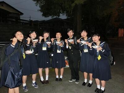 今日一日で16校が発表しました。明日、残りの5校が発表します。17時から生徒交流会があり、ご当地クイズで盛り上がった後、ロビーで生徒同士の名刺交換が行われました。その後、都城特産の牛・豚・鶏の焼き肉が振る舞われ、参加者一同舌鼓を打っていました。