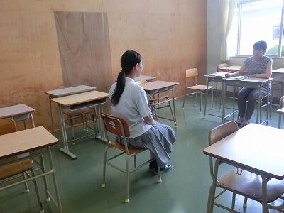 本日も、5.6限目に体育大会の全体練習が実施されました。今、延商は体育大会モード一色というところですが、放課後、学習室を覗くと、3年生が面接練習をしていました。また、進路室では、作文や志望動機の指導を受けている生徒もいました。進路実現と体育大会という二つの目標に向かって頑張る3年生の姿を見ることができました。