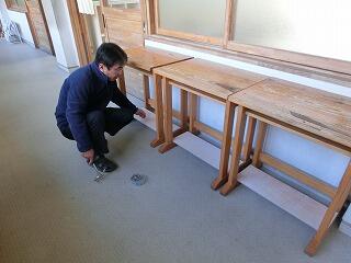 県産材を使った机が古くなり、廃棄処分することになりました。何かリユース(再利用)する方法はないかと考えた結果、部活動生の大きなバッグを置くための机として廊下において活用してみることにしました。
