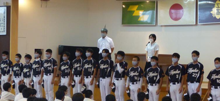 また、本日は終業式にあわせて、ソフトボール部のインターハイ壮行式と同窓会が創立60周年を記念して製作したオリジナルマスクの贈呈式もありました。