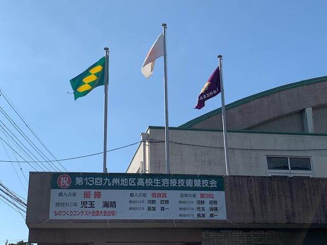 九州地区高校生溶接技術競技会の栄光を讃え、体育館正面に横断幕を掲げました。個人の部で優勝した児玉海晴さん(機械科2年)は、11月13日から2日間の日程で神奈川県で開催される全国大会へ出場します。全国大会での活躍を全校挙げて応援しております。