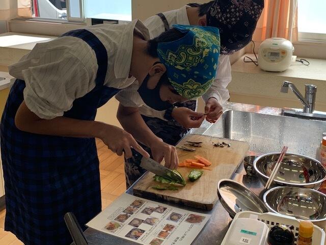 新型コロナウイルスの感染拡大により、対面や密集での作業を中心とする実習はしばらく制限を受けていました。第5波が落ち着いた今がチャンスとばかりに、調理実習に取り組みました。メニューはチキン南蛮。4月から社会で自立する3年生にとっては、大切な実習となります。感染防止対策を十分に図りながら楽しい調理の時間を満喫していました。