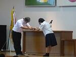 感染症予防の対策として、選手と3年生は体育館に集合し、1・2年生は教室よりリモートで参加しました。
