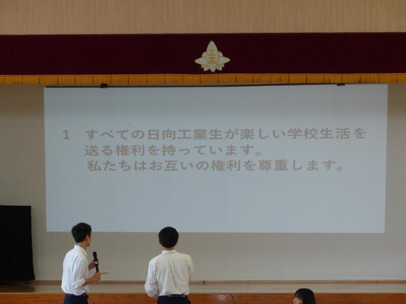 いじめは重大な人権侵害であることを確認し、生徒が安心して学校生活を送るために「いじめは絶対に許さない」という決意とともに宣言文を読み上げました。生徒会からの呼びかけを受け、生徒1人ひとりがいじめについて真剣に受け止め「いじめを許さない」という気持ちを新たにしました。