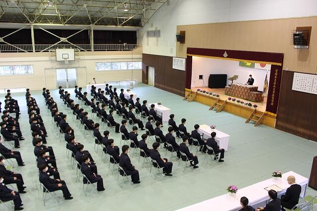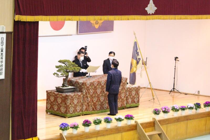 最後になりましたが、本日ご臨席いただいております保護者の皆様におかれましては、お子様のご入学、誠におめでとうございます。また、コロナ禍の中、規模を縮小した形での入学式となりましたが、皆様の御理解と御協力に心より感謝申し上げます。ここにいる生徒たちは、地元宮崎を支える宝です。私たち教職員は、104名の新入生を責任を持って育ててまいります。そして、新入生一人ひとりの進路実現に向け、3年後に、成長した姿で社会に送り出すことをお約束し、式辞といたします。「日向を動かす人となれ」